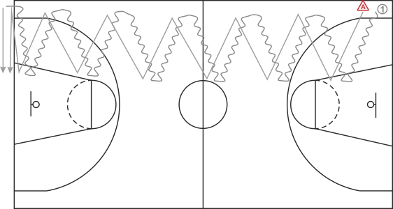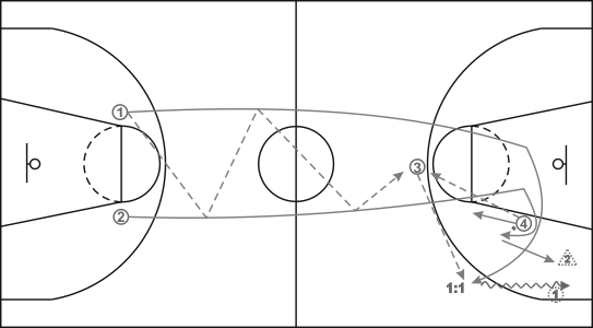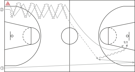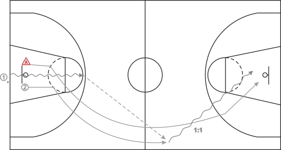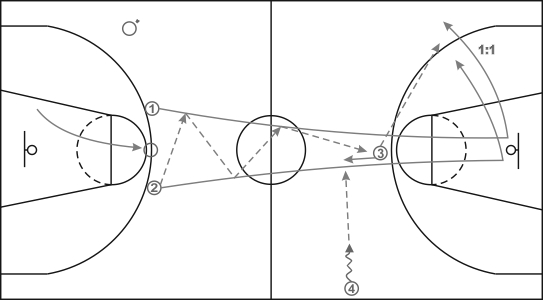 Hráči stojí na úrovni půlicí čáry proti trenérovi (viz diagram). Přihrávající hráč je útočník. Po přihrávce oba hráči sprintují proti trenérovi tak dlouho, než přihraje útočníkovi, ten zahájí hru 1 : 1. Ihned po přihrávce trenéra přihrává další hráč 2 trenérovi, jeho dvojice zahajuje činnost a zakončuje na opačný koš než dvojice předcházející. Útočník má pouze 1 střelu. Po dokončení hry 1 : 1 se oba hráči co nejrychleji zařadí do výchozího postavení a vymění si role. Cvičení plynule pokračuje.