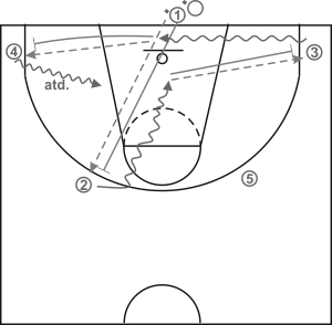 Hráč 1 přihraje hráči 2, vybíhá proti němu a pasivně brání. 1 chytí míč, provede „trojnásobné“ nebezpečný postoj, zahájí vnik otevřeným nebo zavřeným únikem kolem obránce, útočí na koš a v jeho blízkosti přihrává hráči 3. Cvičení pokračuje až k hráči 5, který zakončuje střelbou z krátké vzdálenosti, což je signál k první přihrávce dalšího hráče v zástupu.