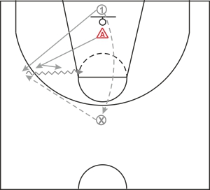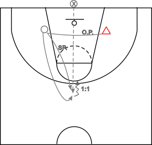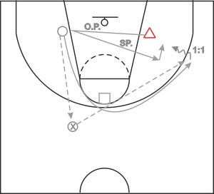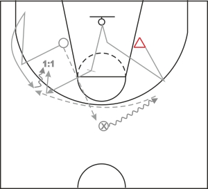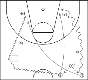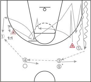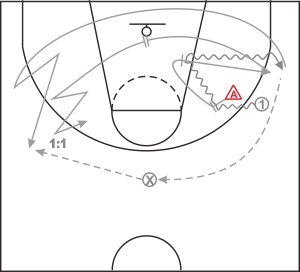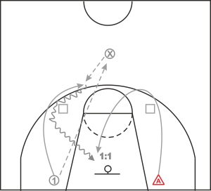 Útočník přihraje míč trenérovi, ten zahájí cvičení driblinkem na stranu obránce (viz diagram). Útočník i obránce musí vyběhnout za tříbodový oblouk. Útočník se může uvolňovat pouze na slabé straně, obránce co nejrychleji zaujme správné obranné postavení (odstoupený k ose hřiště, vidí „svého“ hráče a útočníka s míčem). Trenér přihraje zpět útočníkovi, který zahájí hru 1 : 1 (trenér může z cvičných důvodů počkat s přihrávkou, nechat hráče, aby se déle uvolňoval na slabé straně, resp. bránil hráče bez míče na slabé straně).