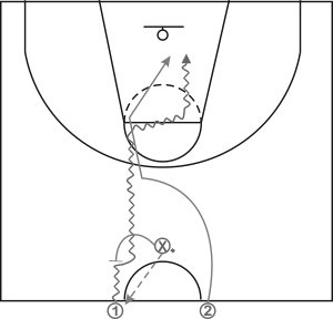 Hráči 1 a 2 si přihrávají v pohybu na protější koš, za půlicí čarou jeden z nich přihraje 3. Oba sprintují do vymezeného území, odkud se útočník, v našem případe 1, uvolní využitím clony od 4 (tento hráč drží míc). Jakmile se 1 dobře uvolnil pomocí clony, 3 mu přihraje. Clonící hráč 4 ihned začíná přihrávkou na 3 a oba si přihrávají v pohybu na protější koš, 1 a 2 dokončí hru 1 : 1, cvičení pokračuje stejně na druhou stranu hriště.