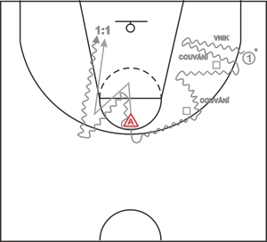 PRŮPRAVNÁ FÁZE: Útočník 1 se uvolňuje s míčem do vnitřního prostoru, ale nezakončuje. Obránce A se snaží jakýmkoli způsobem nepustit 1 do vymezeného území. Hráči bojují o prostor do té doby, než se útočníkovi podaří alespoň jednou nohou dotknout vymezeného území, potom útočník 1 dribluje zpět za tříbodový oblouk a přihraje trenérovi.