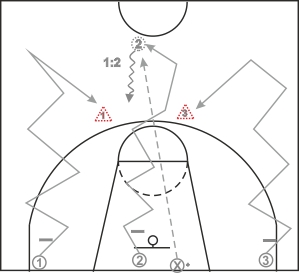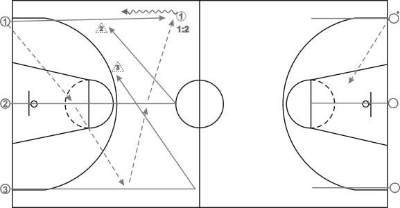 Hráči 1, 2, 3 si přihrávají v pohybu od koncové čáry k protějšímu koši. Na signál trenéra se hráč, který má v držení míč, stává útočníkem a zbývající dva hráči obránci. Hrají 1 : 2 zpět na koš, od kterého vybíhali. Na signál trenéra současně zahajuje činnost (přihrávky v pohybu) trojice za protější základní čarou.