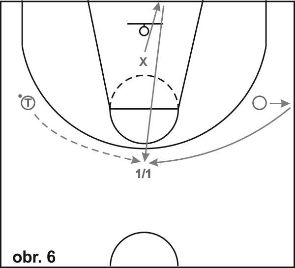 1/1 na polovině hřiště po změně směru - obr. 6. Útočník začíná v tříbodovém prostoru na úrovni prodloužené čáry trestného hodu, obránce ve středu vymezeného území a trenér s míčem u opačné postranní čáry než útočník. Na pokyn oba hráči vyrazí plnou rychlostí k postranní, respektive ke koncové čáře. Oba hráči pak pokračují v pohybu směrem na vrchol tříbodového oblouku. Trenér přihraje míč útočníkovi a následuje řešení situace 1/1. Zatížení můžeme zvýšit počtem opakovaných vyražení k postranní a koncové čáře nebo nasměrováním hráčů na vzdálenější koš.