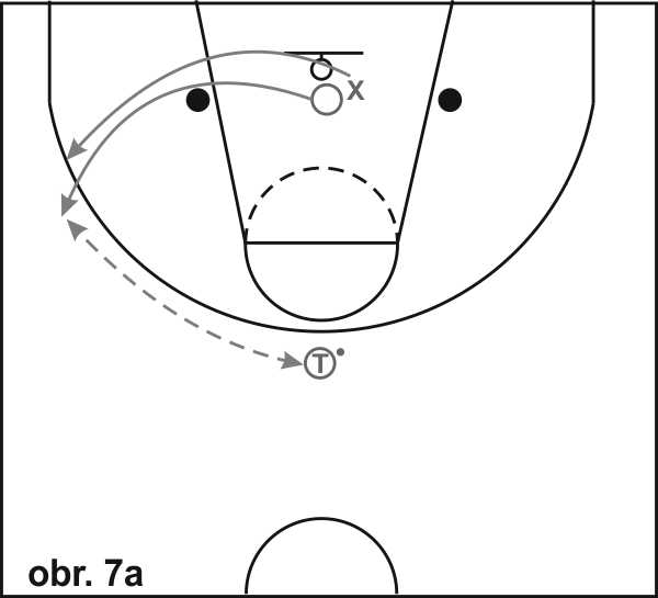 1/1 po uvolňování v prostoru u koncové čáry - obr. 7a, 7b. Dva hráči se postaví vedle vymezeného území - jeden vpravo, druhý vlevo - čelem ke koši. Útočník a obránce začínají v prostoru pod obroučkou, trenér s míčem se postaví na vrchol tříbodového oblouku. Na pokyn trenéra se útočník uvolňuje do tříbodového prostoru kolem pasivně clonícího hráče na straně vymezeného území, kde chytá míč, a zaujme trojnásobně nebezpečný postoj. Rychle přihraje míč zpět trenérovi a uvolňuje se do tříbodového prostoru směrem na druhou stranu hřiště - kolem hráčů na stranách vymezeného území -, kde chytá míč přihraný trenérem a následuje řešení situace 1/1. Obránce se snaží svým pohybem zabránit útočníkovi chytit míč, nebo jej vytlačit co nejdále od tříbodové čáry.
