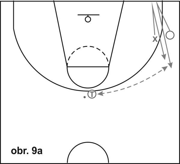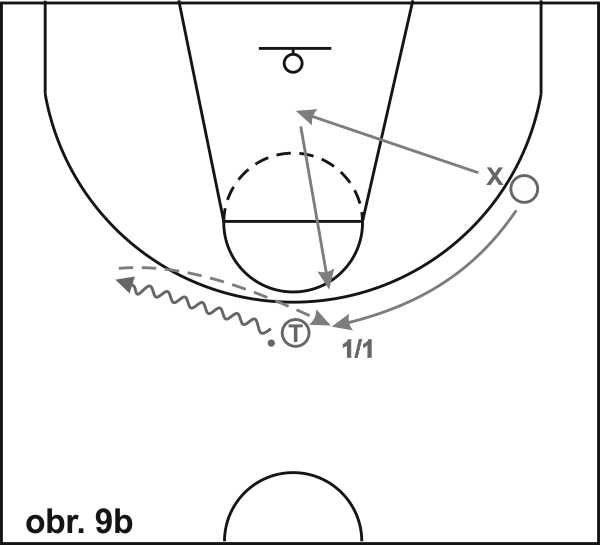 1/1 z vrcholu tříbodového oblouku po obranném pohybu - obr. 8. Hráči začínají na rozích čáry trestného hodu zády k trenérovi. Trenér s míčem zaujme postavení u půlicí čáry. Na povel vystartují oba hráči plnou rychlostí obranným pohybem směrem k bližší postranní čáře a zpět do původního postavení. Tuto činnost provádějí hráči po dobu 8 - 12 vteřin. Po uplynutí stanoveného času vhodí trenér míč do tříbodového prostoru a zakřičí „hra“. Na tento signál hráči vystartují směrem k míči. Hráč, který získá míč jako první, se stává útočníkem, hráč bez míče obráncem. Následuje řešení situace 1/1. Obtížnost můžeme zvýšit nasměrováním hráčů na vzdálenější koš.