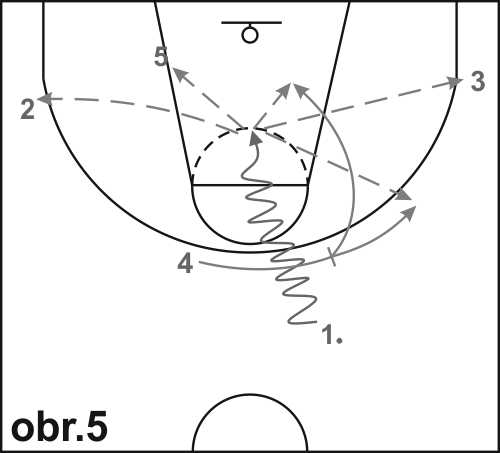 Pro dokreslení jeho slov najdete na obrázcích jeho jednoduché kombinace, které úspěšně využíval v posledních letech. Na obrázcích 1 až 3 je kombinace, jejímž cílem je vytvořit otevřenou střelu z tříbodového prostoru pro hráče 2, nebo zakončit z vymezeného území. Na obrázcích 4 a 5 je znázorněna kombinace založená na clonění pro hráče s míčem, přičemž clonící hráč 4 je dobrý střelec z dlouhé vzdálenosti. Vniknutím hráče s míčem do vnitřního prostoru se vytvoří více příležitostí pro přihrávku a následné zakončení.