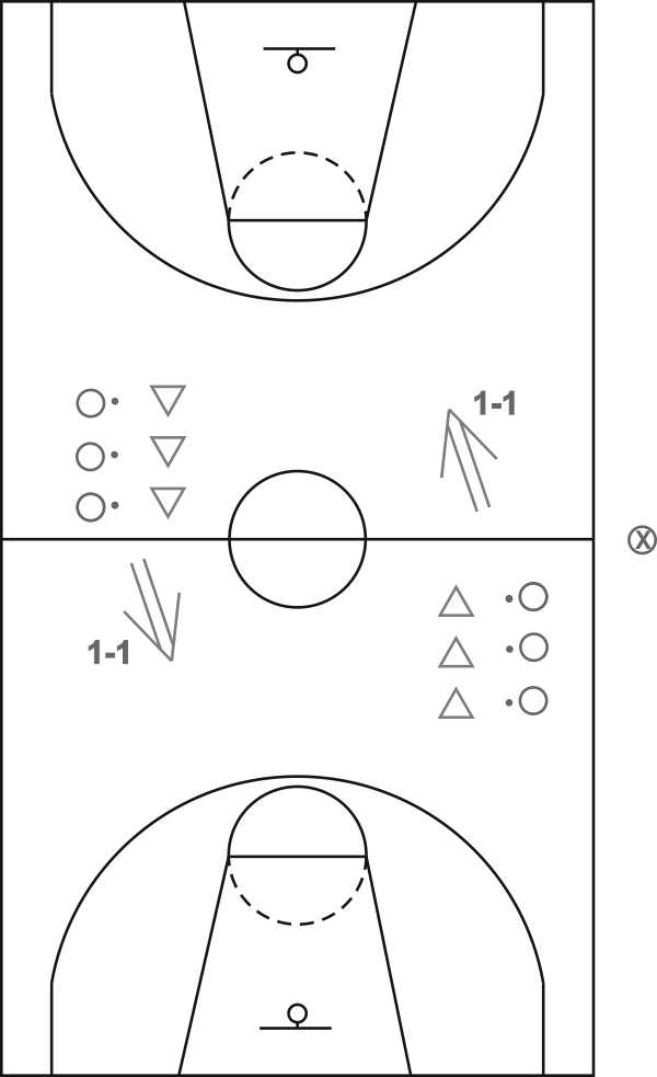 Od okamžiku uchopení míče, má útočník možnost uniknout obránci a zakončit svoji činnost střelbou. Obránce brání aktivně, ale se snahou nedopouštět se osobních chyb – faulů. Cvičení končí buď úspěšnou střelbou na koš, nebo získáním míče obráncem.