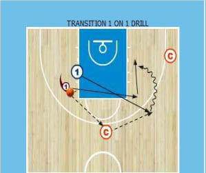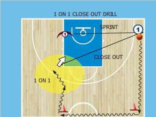 Diagram 9 – 1 na 1 close out dril, obránce přihraje trenérovi, ten přihraje (kutálí nebo o zem apod.) jednomu ze dvou útočníků na perimetru, obránce se musí správně a rychle rozhodnout a využívá close out k obraně hráče s míčem.