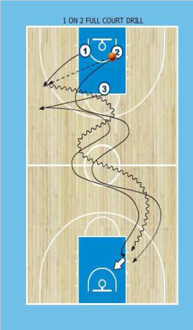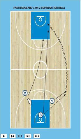 Cvičení zahájíme střelou (hráč č. 2) a doskokem (hráč č. 3) následuje přihrávka na hráče č. 1, který hraje do koše situaci 1 na 2 (diagram 17). Hráč č. 3 při doskoku komunikuje „mám“ a poté může i říct jméno hráče, jemuž přihrává. Na druhé straně hráč č. 1 po zakončení a doskoku hráče č. 2 opět přijme míč a hraje na zpět proti hráči č. 2 a hráči č. 3 situaci 1-2 (diagram 18).
