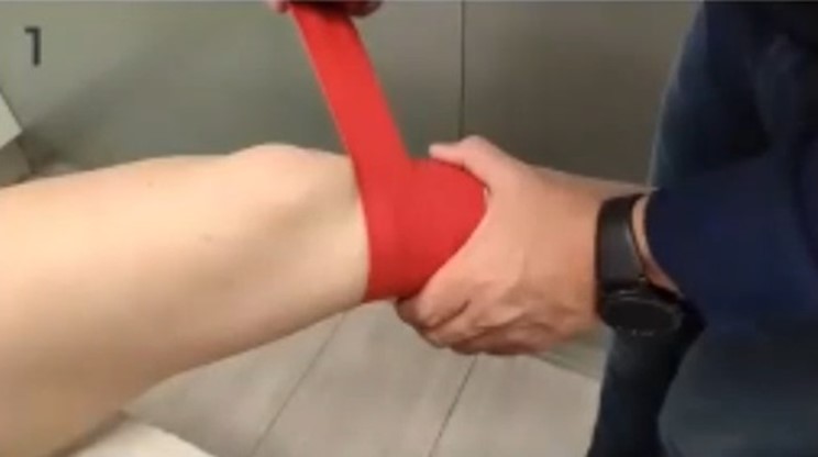 Obr. č. 19 Aplikace flossbandu na distální část kolene |
