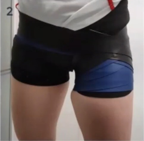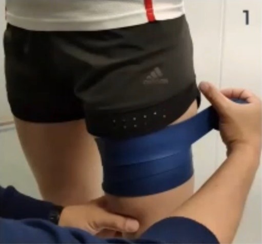 Je potřeba nejméně dvou kusů flossbandu. První flossband je aplikován v horní část stehna tak, aby zasahoval do oblasti třísel. Druhý flossband omotává horní část stehna a zejména pánev (Obr. č. 24).