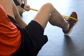 Kostas na závěr své prezentace uvedl, že pokud provádíme nějaký cvik, je důležité jej provádět správně. Příkladem je využití gumy při tréninku svalů kotníku (např. po zranění), kdy na první pohled může provedení cviku vypadat správně, ale pracují rozdílné svalové skupiny (externí a interní rotátory kyčelního kloub (obr. č. 35), ne svaly kotníku! (obr. č. 36). Je důležité cviky volit smysluplně a se znalostí biomechaniky pohybu!