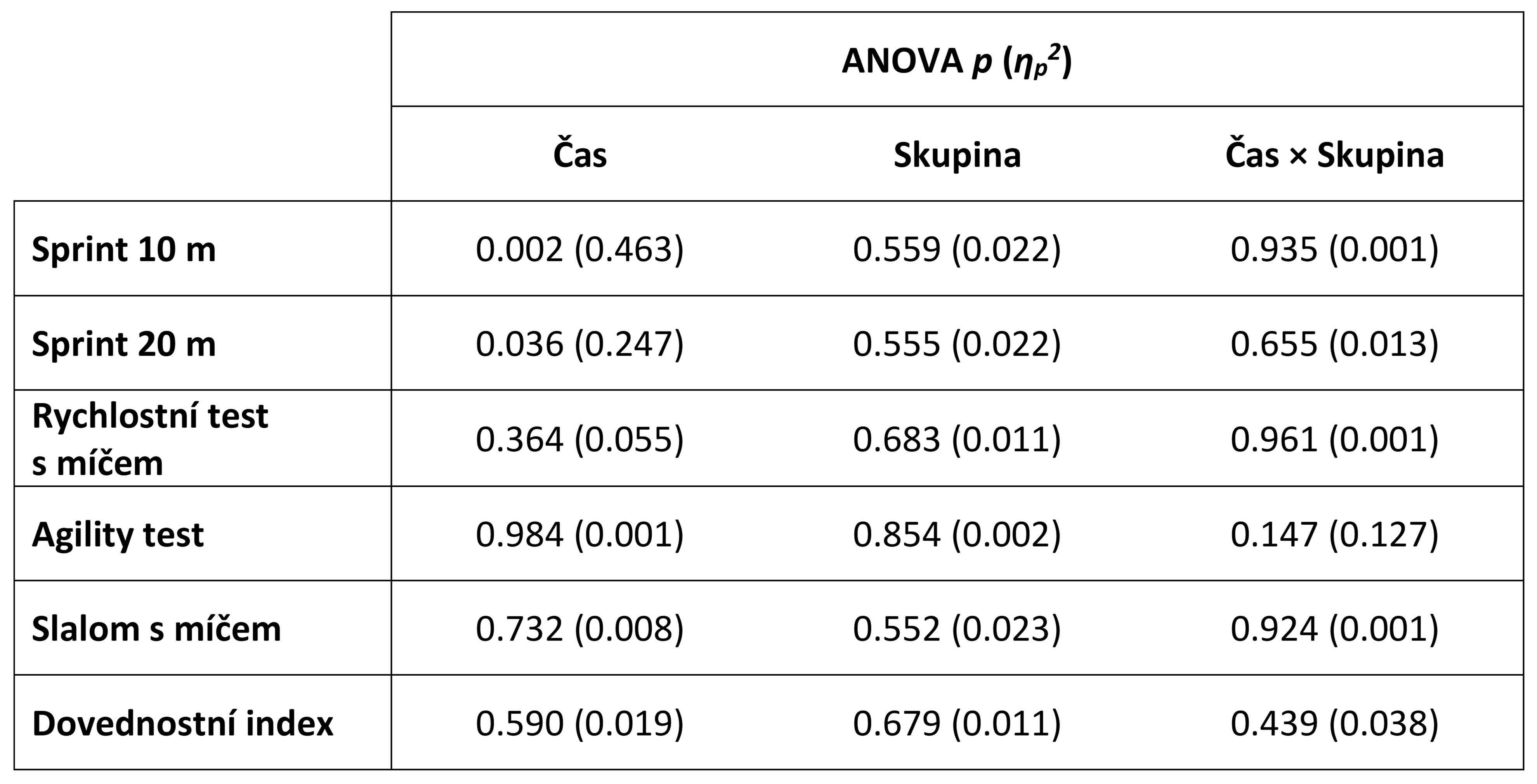 Tabulka 3 – Změny ve výkonech rychlostních a rychlostně-koordinačních parametrů před a po tréninkové intervenci u mladých hráčů fotbalu (ANOVA = analýza rozptylu (statisticky významné pokud p < 0.05); ηp2 = druhá mocnina koeficientu Eta (velký efekt pokud ηp2 ≥ 0.138)).