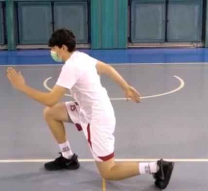Následuje cvik přechodu ze výponu na špičkách ve vzpažení do pozice ve “split” dřepu. V této nízké pozicu dochází k protažení svalů přední části stehna a rozložení těžiště z cca 60% na přední chodidlo, 40 % na zadní chodidlo.