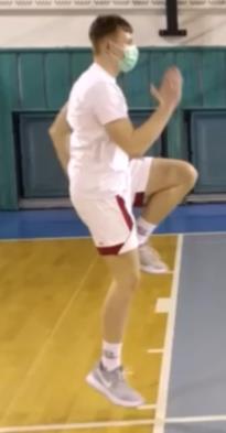 Obdobně jako u předchozího cviku. „Pogo“ poskoky na jedné s kolenem před tělem a rychlým zašlápnutím (na místě). Pokud je někdo “zabalený” může mít problém se stabilitou nebo se silou DK.