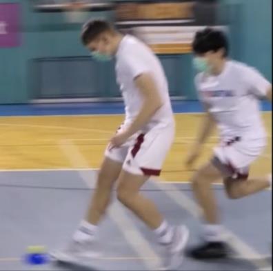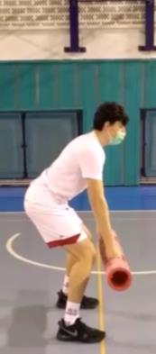 Cvik ve dvoji. Jeden hráč schazuje stojící posilovací tubus směrem šikmo k hráči, druhý hráč se snaží posilovací tubus zastavit před tím, než dopadne na zem. Nacvičujeme akceleraci, rychlé snížení a zastavení.