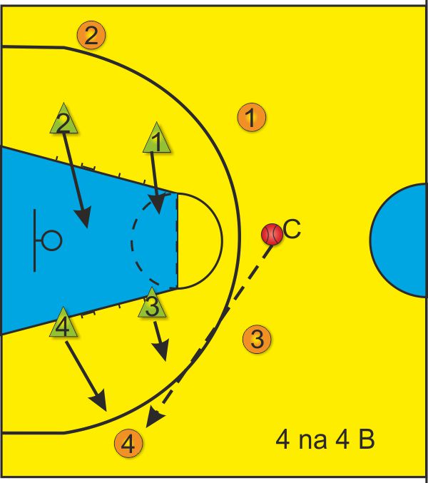 4 obránci a 4 útočníci stojí v rozestavení dle obrázku A. Jakmile trenér udeří s míčem o zem (silný dribling), hráči jdou obranným pohybem k sobě, tlesknou o sebe dlaněmi a vrací se zpět do původního postavení. Poté trenér přihrává zvolenému hráči, na obr. je to útočník 4. Jeho obránce jde do postavení close out, ostatní do postavení vůči míči a svému útočníkovi. Cvičení opakujeme.