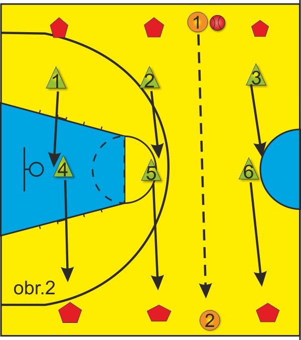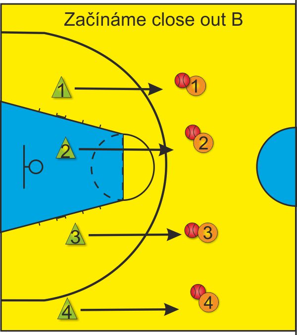 Obránci drží míč, na znamení přihrají útočníkům a běží do pozice close out. Zpočátku dbáme především na správnou techniku přistoupení k útočníkům a to i na úkor rychlosti. Zároveň cvičíme určený typ přihrávky a příjem míče v pozici trojího ohrožení koše. Pro zvýšení důležitosti momentu mohou obránci při pohybu k útočníkovi zvolat „míč,míč“. Cvičení v této podobě šetří čas, protože jej mohou provádět všichni hráči najednou.