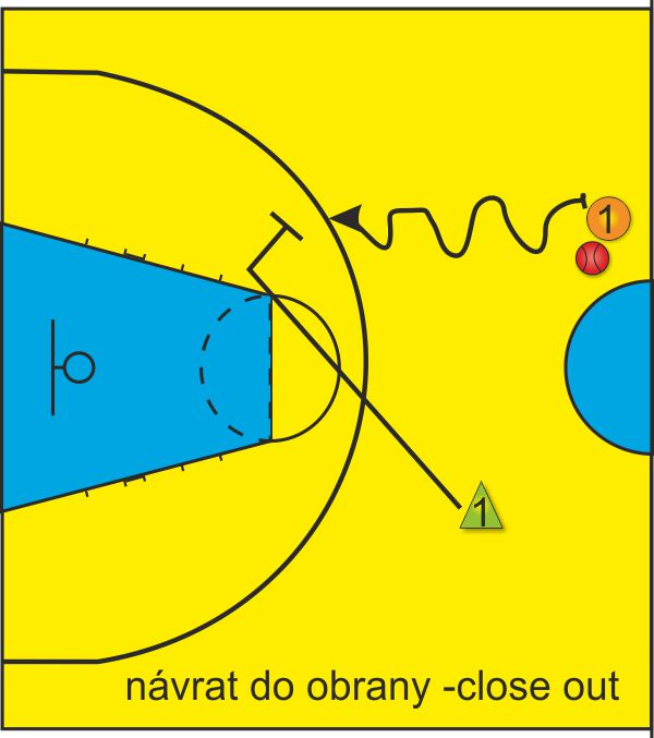 Zvolený obránce sprintuje do pozice close out, zbylí dva obránci do správného obranného postavení. Můžeme nechat trojice hrát na koš.
