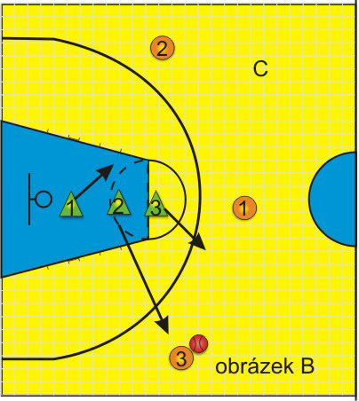 Cvičení zahájíme postavením tří obránců do řady (viz obr. A) a tří útočníků na perimetru. Trenér má míč, zvolí si libovolného útočníka, kterému přihraje míč a zvolá číslo (jméno) obránce.
