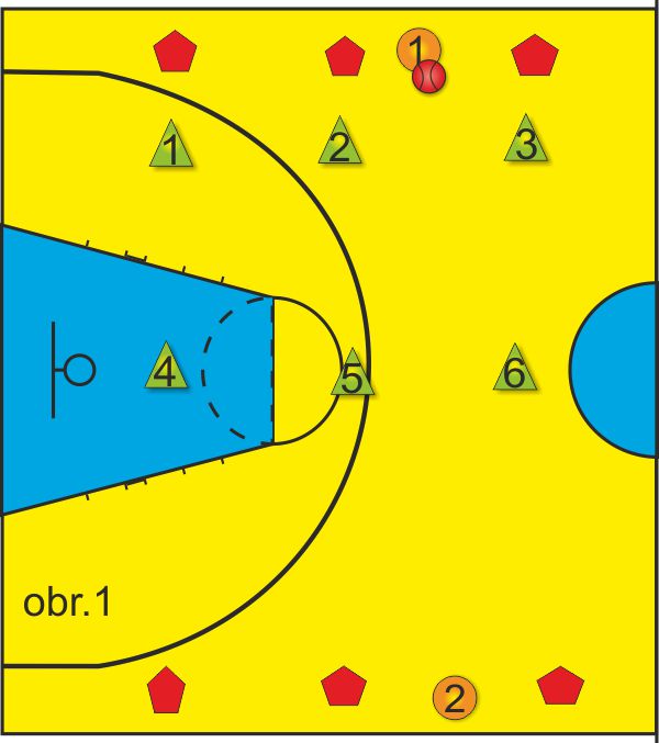 - s míčem, obránce 2 v postavení výpomoci na ose koš-koš