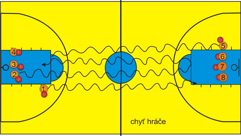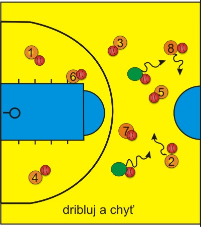 Všichni hráči mají míč, rozdělíme hráče na dvě skupiny, každá skupina stojí u jedné koncové čáry. Hráč, který začíná cvičení, se posune na čáru trestného hodu. Na znamení vybíhá driblinkem a současně s ním hráč od koncové čáry. Na obrázku se jedná o hráče č. 1 a č. 2. Úkolem hráče č. 2 je dostihnout hráče č. 1 dříve než se dostane na čáru trestného hodu na opačné polovině hřiště. Zde se hráč č. 2 otáčí a dribluje zpět. V ten moment vyráží další hráč ze základní čáry, na obrázku jde o hráče č. 5 a opět je jeho rolí dostihnout hráče č. 2 dříve, než se dostane přes čáru trestného hodu. Cvičení takto kontinuálně pokračuje.