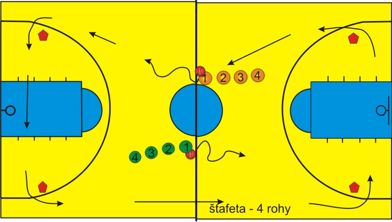 Určíme 2 týmy, v každém týmu je jeden míč. Hráči s míčem zahájí driblink na pokyn trenéra. Jejich úkolem je driblovat okolo čtyř kuželů, které jsou rozmístěné v rozích hřiště a předat míč dalšímu spoluhráči. Vyhrává tým, jehož hráči absolvují určenou trasu rychleji.