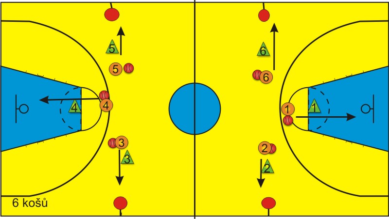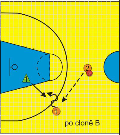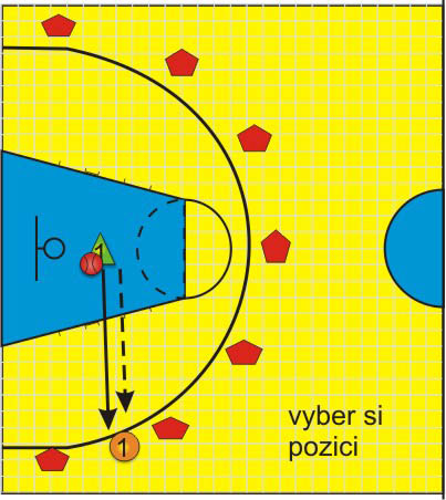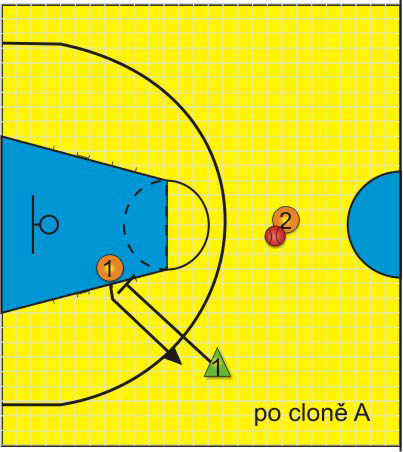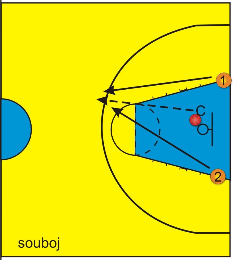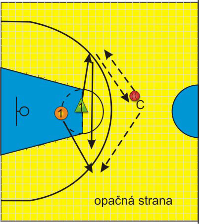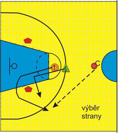Umístíme kužele na pozice dolního posta. Trenér stojí s míčem v prostoru a před ním stojí na perimetru za sebou útočník a obránce. Útočník vyběhne na znamení směrem ke koši, následován obráncem. Jakmile dosáhne úrovně kuželů, zvolí si stranu a na této straně vyběhne na perimetr. Tam dostává přihrávku od trenéra. Obránce jej následuje. Hra 1na1 začíná ihned poté, co útočník obdrží přihrávku od trenéra.
