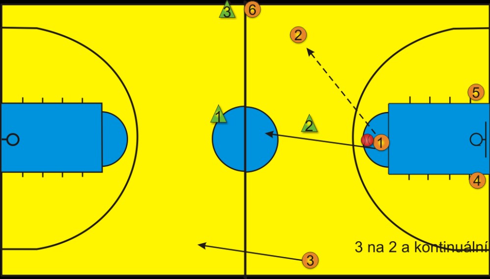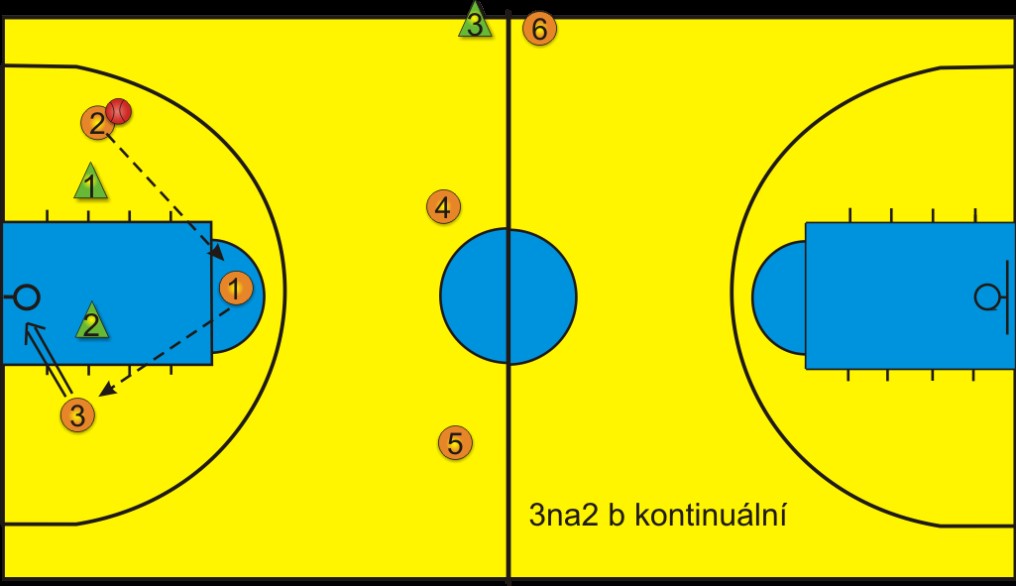Na obrázcích je znázorněno cvičení pro tři trojice. První trojice (oranžoví 1, 2, 3) útočí proti dvojici obránců (zelení 1, 2). Útočnicí nesmí driblovat, pouze přihrávat. Trenér stanoví časový limit, do kterého musí útočící tým vystřelit. Limit určí podle vyspělosti hráčů, např. 12 vteřin.