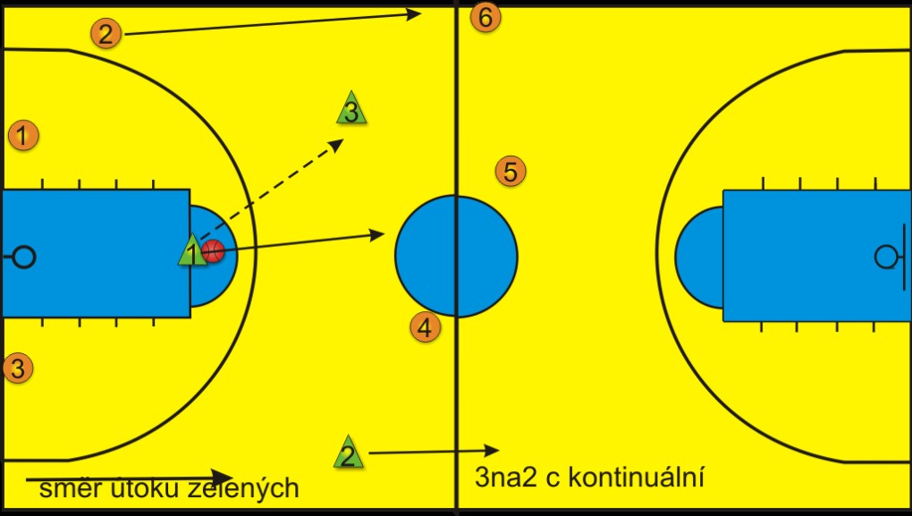 V průběhu útoku první trojice se posouvají hráči 4 a 5 na polovinu, kde první trojice útočí, třetí (na obr. hráč č. 6) zůstává u postranní čáry. Po získání míče útočí trojice zelených (připojí se zelený hráč č. 3) proti dvojičce 4 a 5. Platí stejná pravidla útoku a cvičení kontinuálně pokračuje. Hráč z první trojice č. 2 jde k postranní čáře a hráči 1 a 3 se přesouvají za útočící trojicí zelených na opačnou polovinu hřiště.