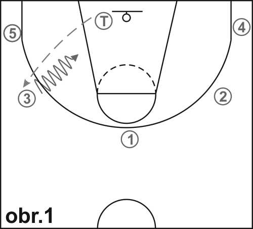 Rozestavte rovnoměrně hráče vně tříbodového oblouku (obr. 1). Trenér se postaví s míčem pod koš a zahájí činnost přihrávkou kterémukoli hráči (na obr 1 je to hráč 3), který po chycení ihned vniká driblingem do vymezeného území se zjevným úmyslem vystřelit zpod koše. V utkání tato činnost přitáhne obvykle pozornost několika obránců. Vnikající hráč pak přihraje kterémukoli ze spoluhráčů (na obr. 1 je to hráč 4) za tříbodovým obloukem. Komu přihraje, záleží na jeho rozhodnutí.