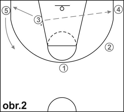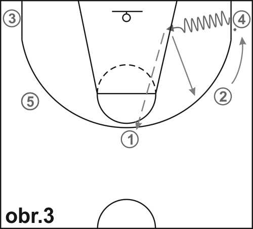 Pokračování průpravného cvičení (obr. 2 a 3): hráč 4 vniká ke koši driblingem, přihraje například hráči 1. Hráč 2 se přesune na jeho místo a 4 se postaví na místo 2.
