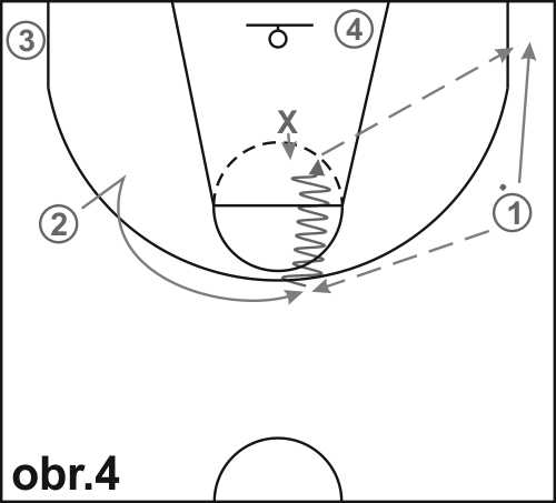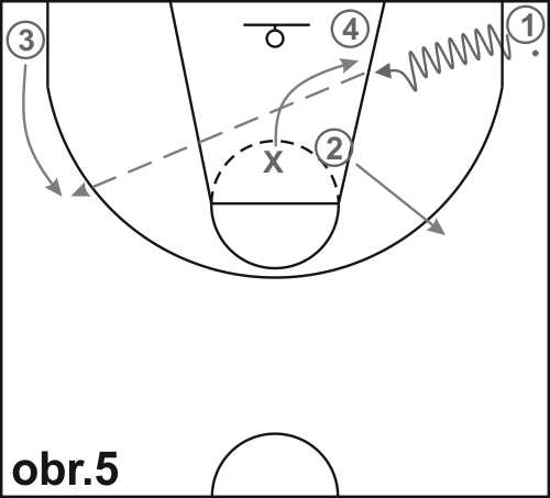 Útočníky 1-4 rozestavte, jak je znázorněno na obr. 4. Obránce X začíná ve středu vymezeného území. Na pokyn trenéra se hráč 2 uvolňuje „V“ únikem směrem na vrchol tříbodového oblouku, kde chytá míč přihraný hráčem 1 a ihned vniká driblingem do vymezeného území se zjevným úmyslem - stejně jako v průpravném cvičení - zakončit střelbou z krátké vzdálenosti.