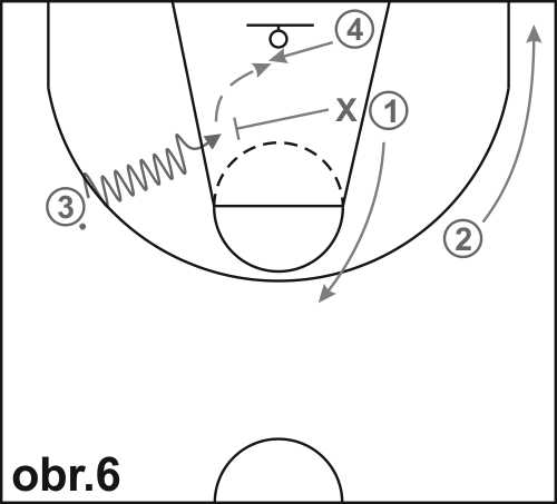 Obránce X se snaží svým pohybem co nejvíce ztížit vnikajícím hráčům jejich činnost s míčem. V momentě, kdy hráč 3 vniknul s míčem do vymezeného území, se obránce rozhodne, jestli bude bránit hráče s míčem, nebo hráče 4, který se uvolňuje pro chycení přihrávky od hráče 3 v bezprostřední blízkosti koše (obr. 6). Poslední vnikající hráč na základě „čtení“ situace buď zakončuje střelbou, nebo přihraje hráči 4.