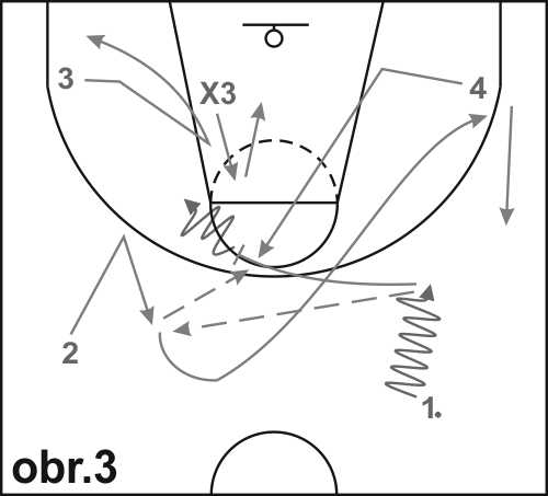 Na obrázku 3 je znázorněna podobná situace. Hráč 3 se ale nemůže uvolnit pro chycení míče (obránce X3 je před ním). Pokračujeme tedy přihrávkou hráče 1 hráči 2 a následným uvolněním hráče 4 směrem na vrchol tříbodového oblouku. Pokračujeme, jak je znázorněno na obrázku.