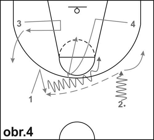 Na obrázku 4 se snažíme zdokonalit clonění pro hráče s míčem a další základní činnosti, které se ve cvičení vyskytují. Snažíme se klást důraz na rychlé a včasné uvolnění clonícího hráče 4, dobrou techniku clonění, dribling hráče 1 těsně kolem clonícího a následné správné rozmístění hráčů na hřišti.