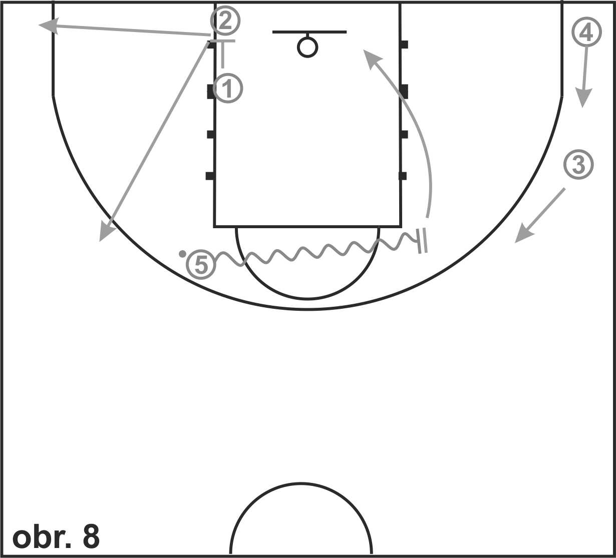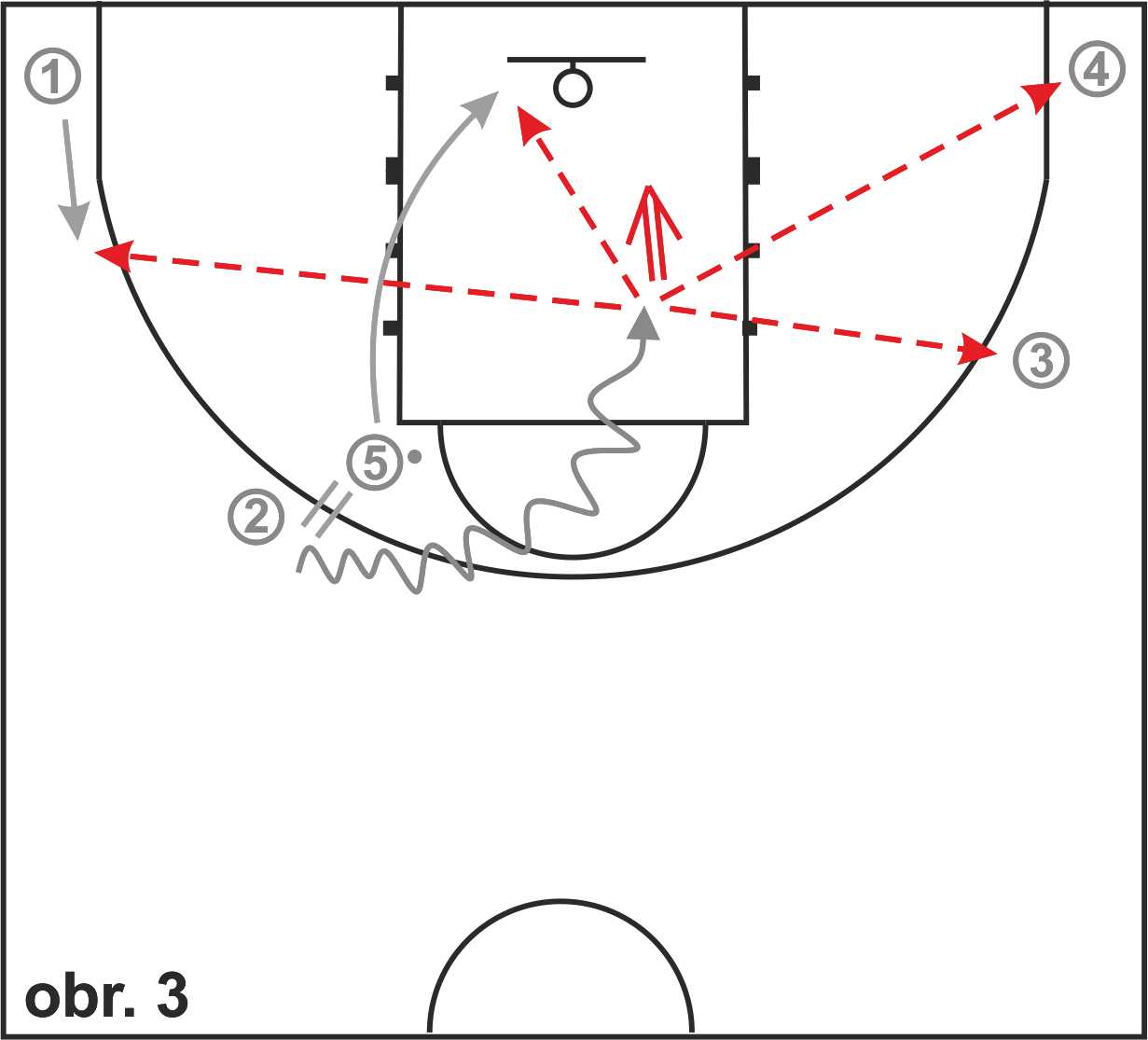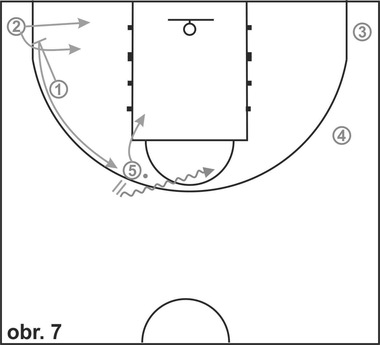 - jeden vyťahovací driblink a prudká prihrávka na hráča č.1, ktorý podľa reakcie obrany zakončuje, atakuje vymedzené územie prihrávkou na hráča č.5, alebo využíva driblinkový nájazd do vymedzeného územia
