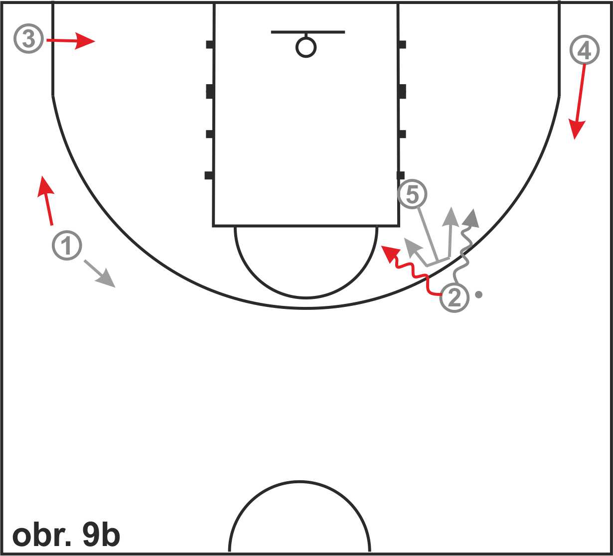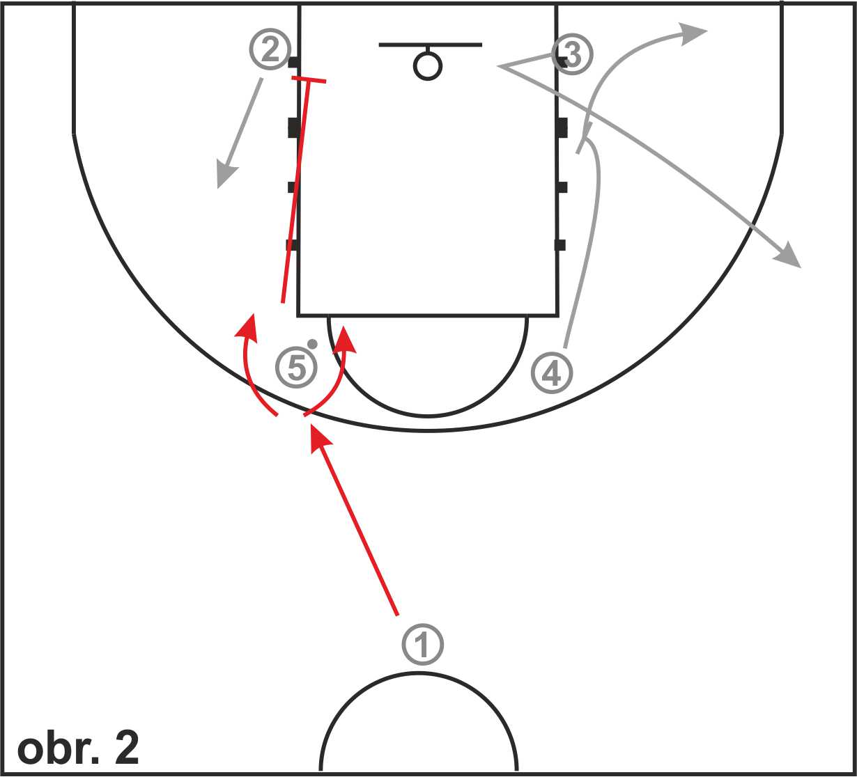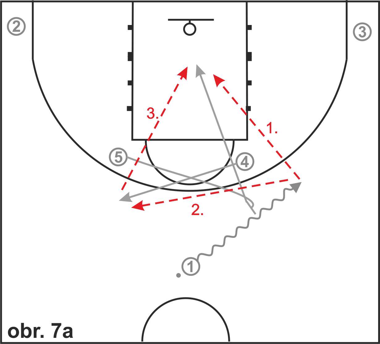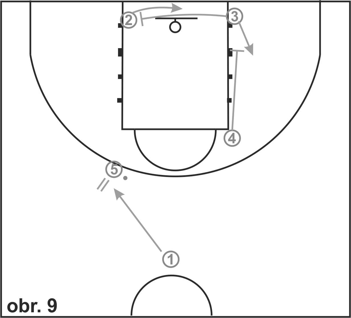 - jeden vyťahovací driblink a prudká prihrávka na hráča č.1, ktorý podľa reakcie obrany zakončuje, atakuje vymedzené územie prihrávkou na hráča č.5, alebo využíva driblinkový nájazd do vymedzeného územia