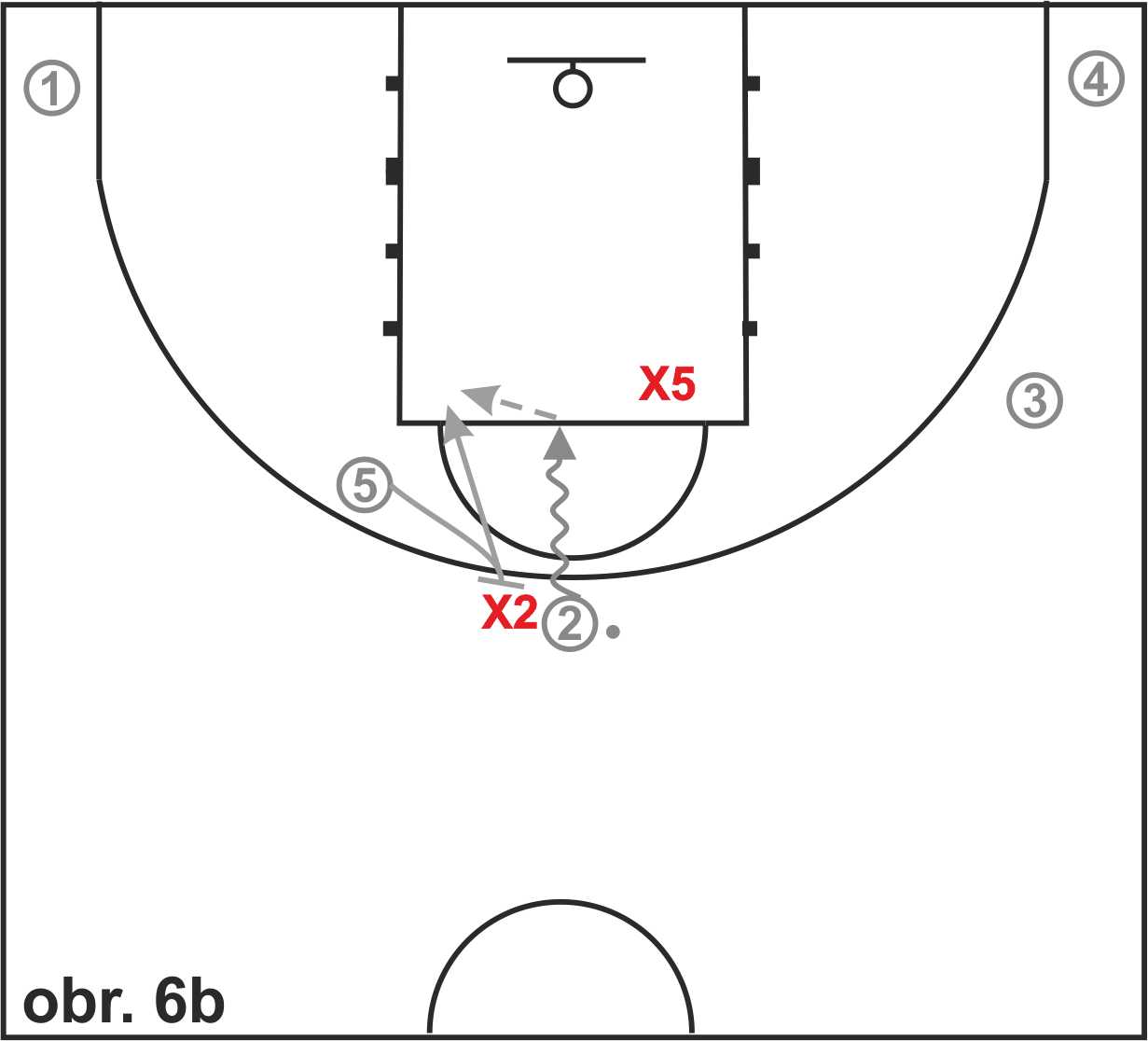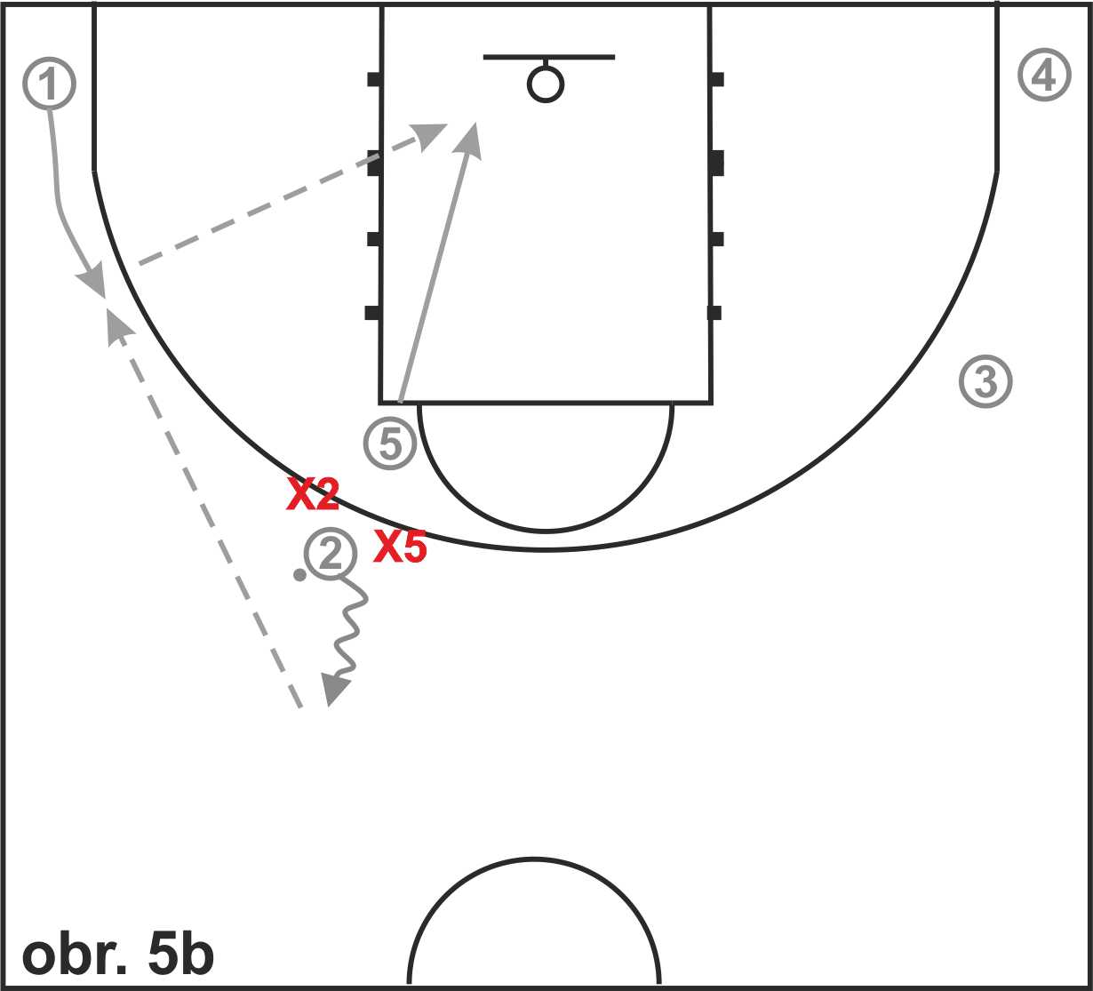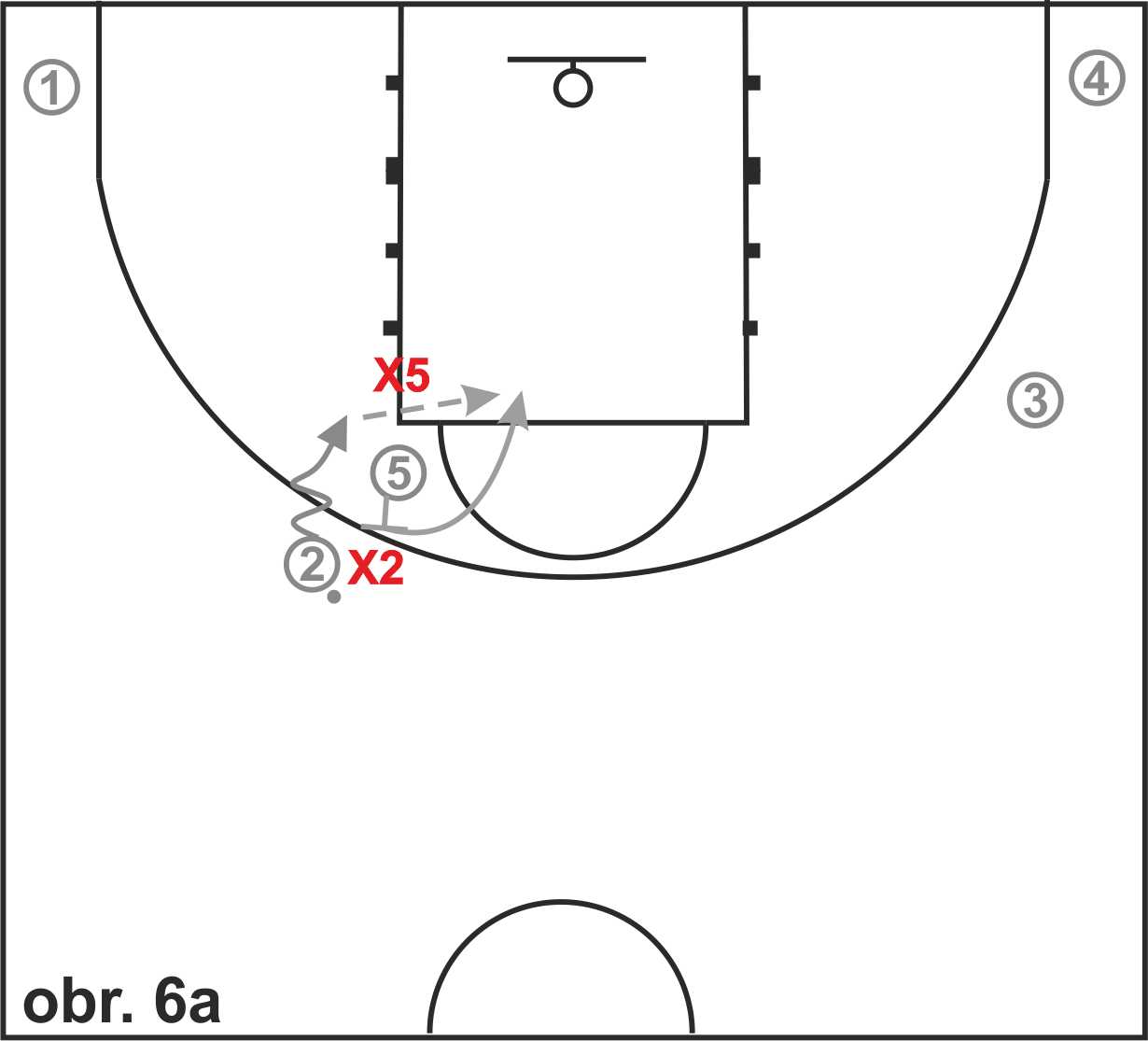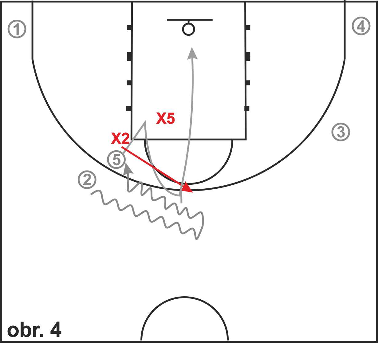 - Obdobné riešenie nastáva, ak obranca X2 nepustí svojho útočníka do využitiaspätného "pick and roll". Ďalšia spolupráca hráčač.5 je po obdržení prihrávky s hráčom č.1, pretože výpomoc maže prísť od jeho obrancu