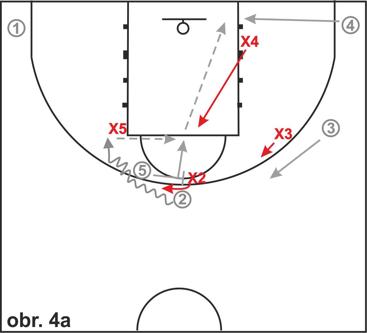 Na obr. 4a je znázornené ideálne riešenie spolupráce vysokých hráčov, pri najčastejšej reakcií obrany, kedy s rolujúcim hráčom č.5 vypomáha obranca hráča č.4. Obranca hráča č.3 nejde do výpomocí z dôvodu, že na tejto pozícii je excelentný strelec za 3b.