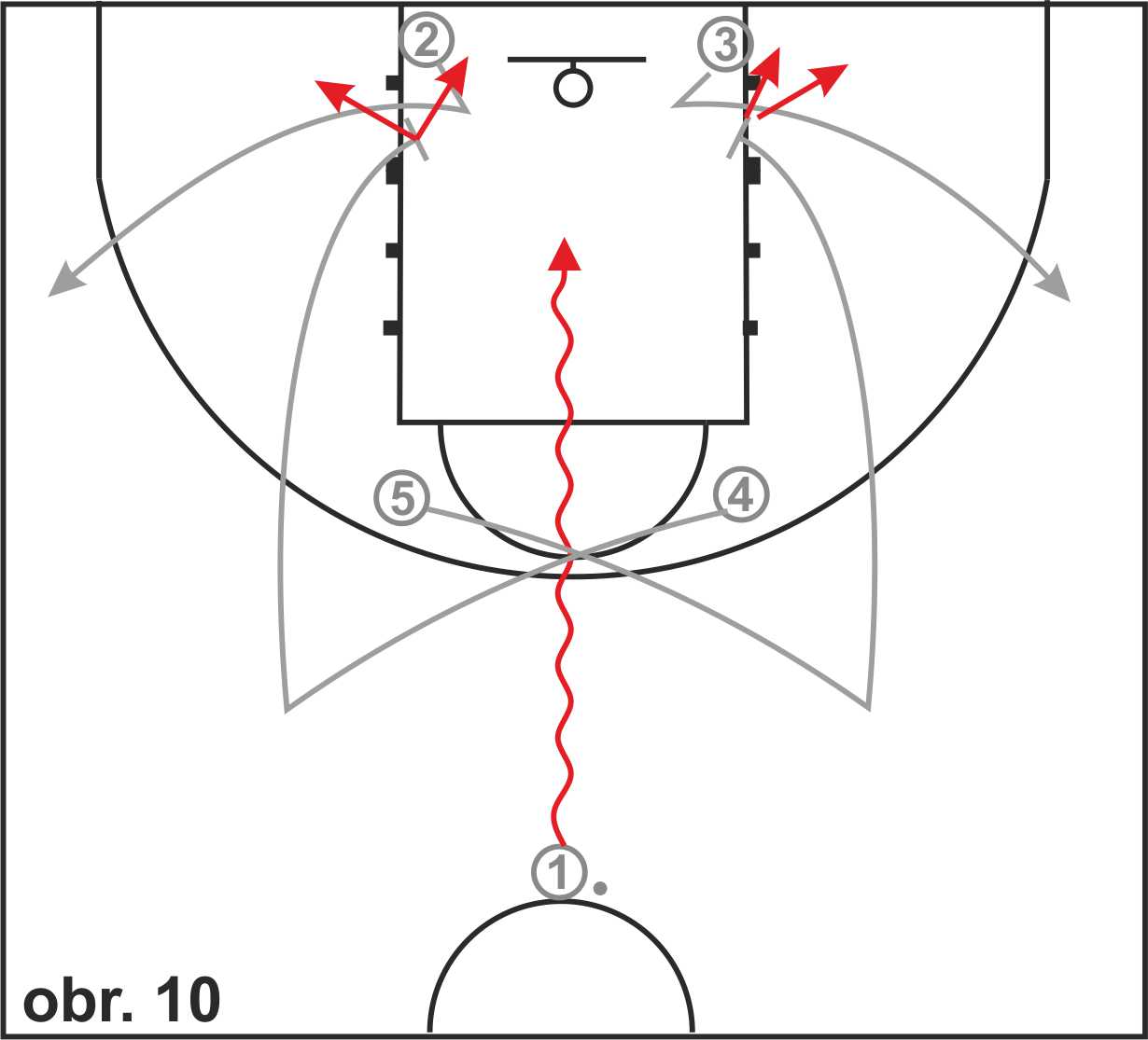 Veľa trénerov rieši útočné situácie v časovej tiesni zahratím kombinácie „pick and roll". Ak však máte v týme hráča, ktorý je výnimočný v hre 1/1 z driblinku, tak máte možnosťvyužiť situáciu ako na obr. 10.