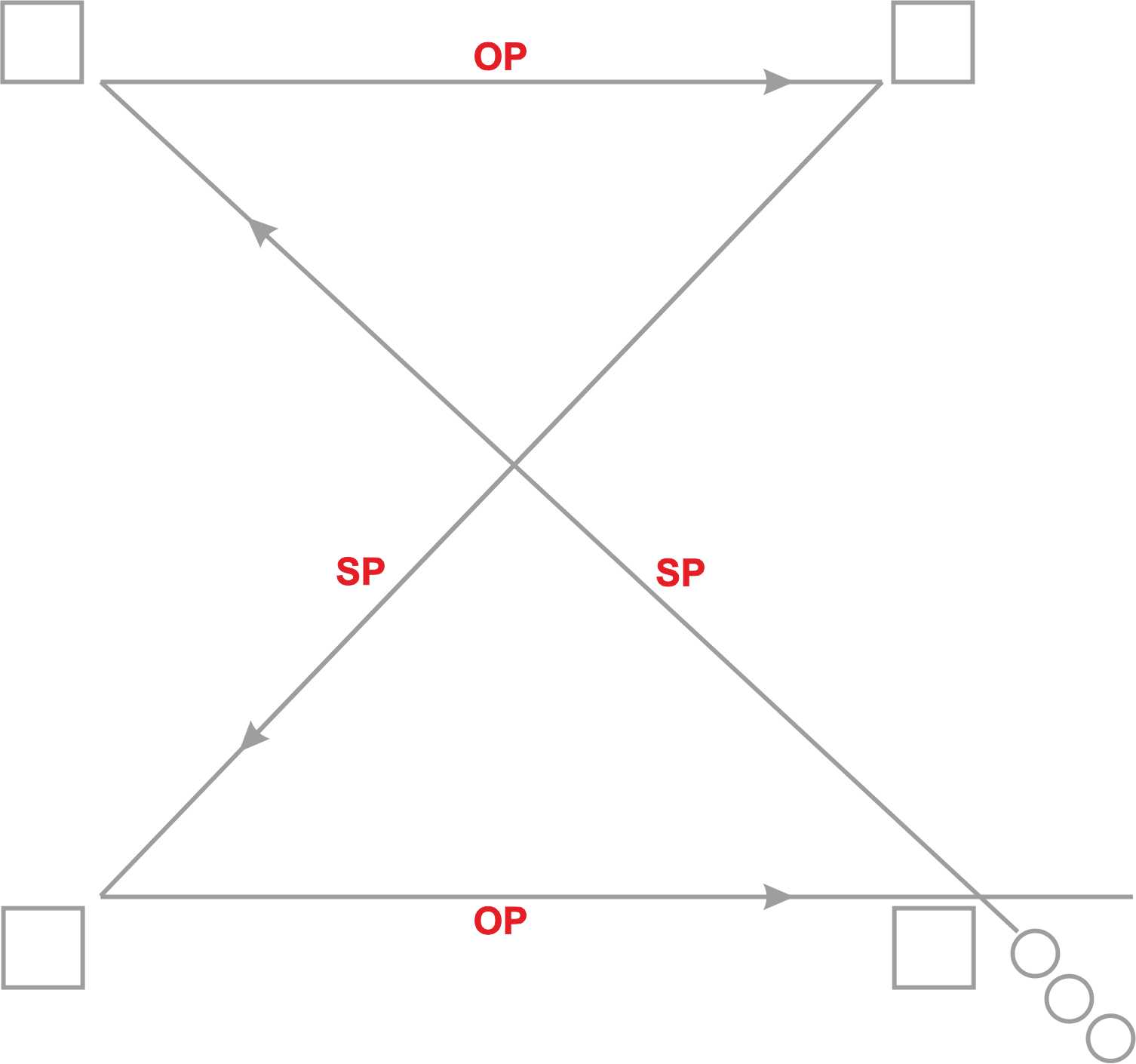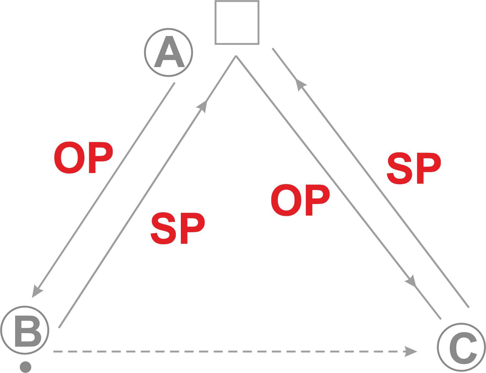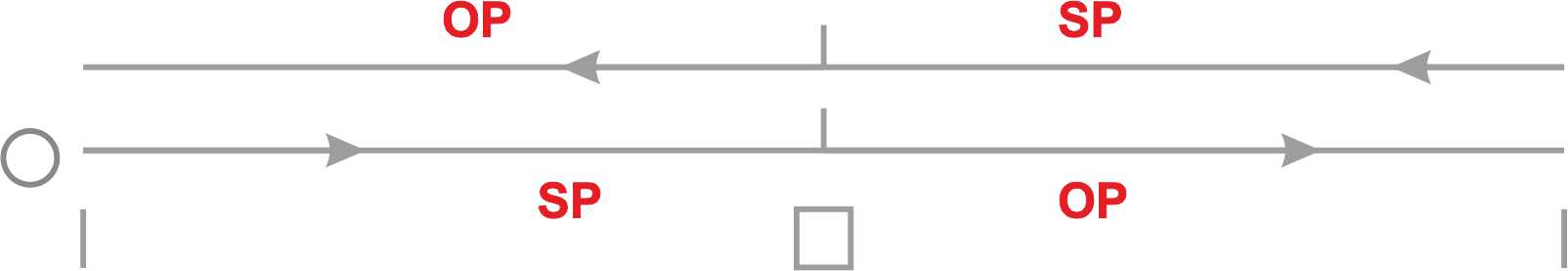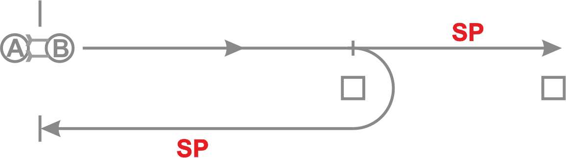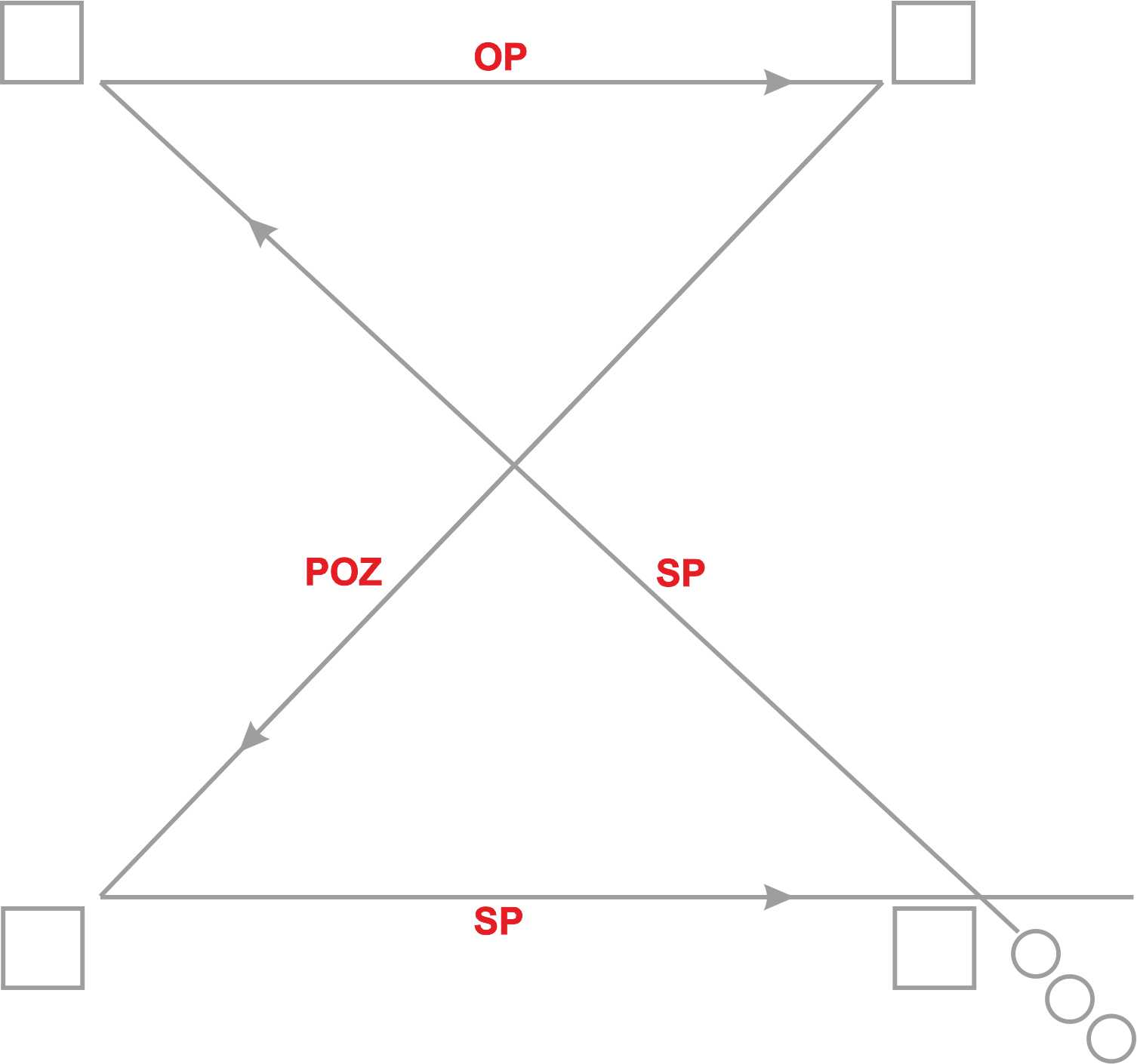 - Hráč A provádí bržděný obranný pohyb ke kuželu, jakmile ho B pustí, sprintuje, chytá přihrávku od C a zakončuje v plné rychlosti. B sprintuje zpět.