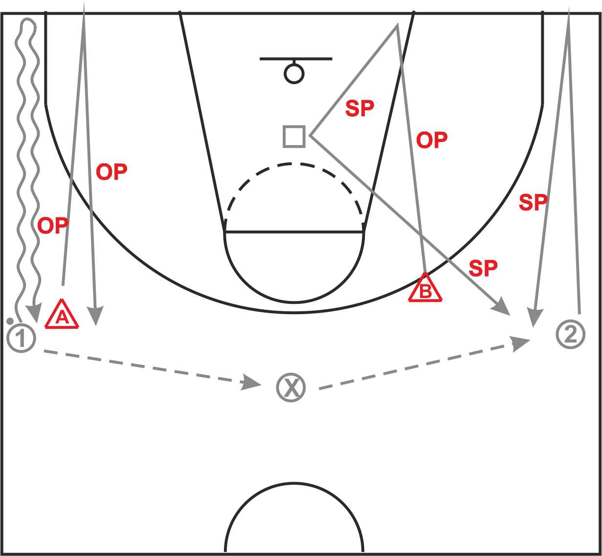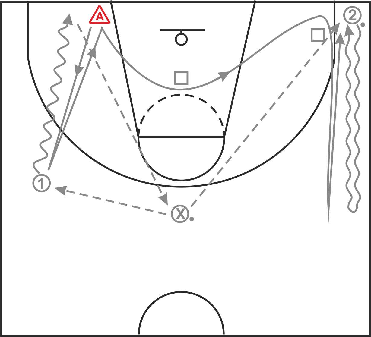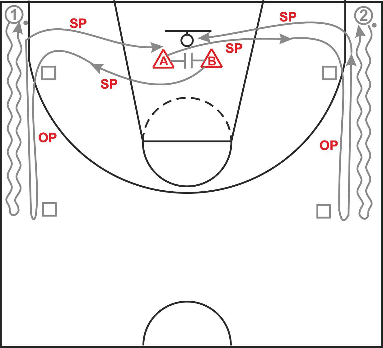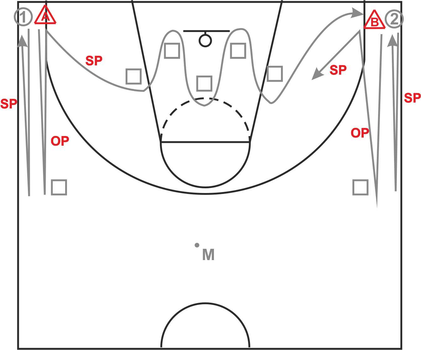 - Hráči 1 a 2 mají míč a stojí v rohu hřiště. Obránci A a B začínají „přetlačováním“ pod košem po dobu 3 sec.. Na pokyn trenéra se snaží co nejrychleji dostat „pod kontrolu“ hráče s míčem na protější straně. Útočníci 1 a 2 začínají driblink ke kuželu a zpět v momentě, kdy A a B opouští vymezené území. Obránci se snaží sprintem, resp. obranným pohybem sledovat útočníky, když jsou zpět na koncové čáře sprintují pod koš, opět se přetlačují, na pokyn trenéra cvičení pokračuje.