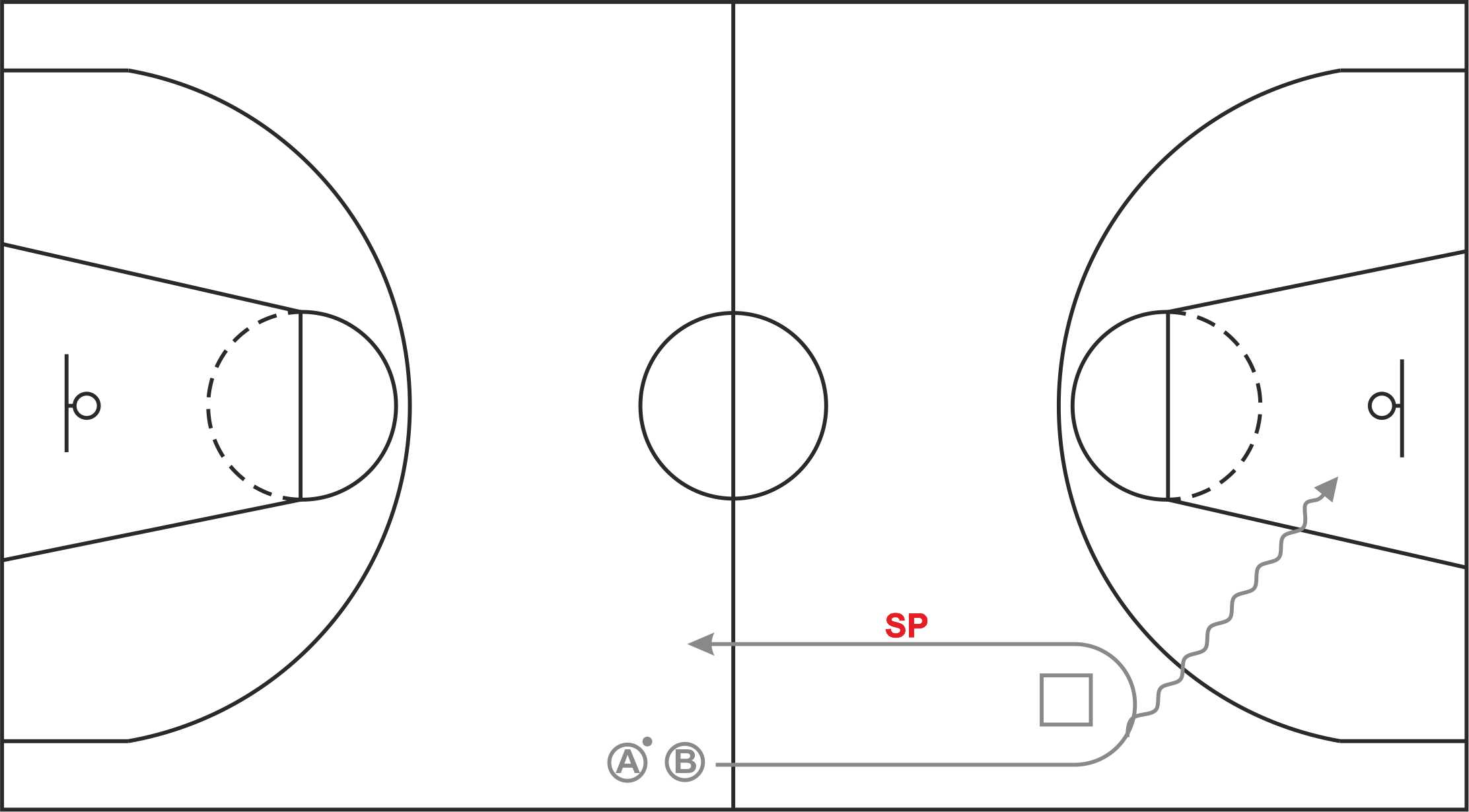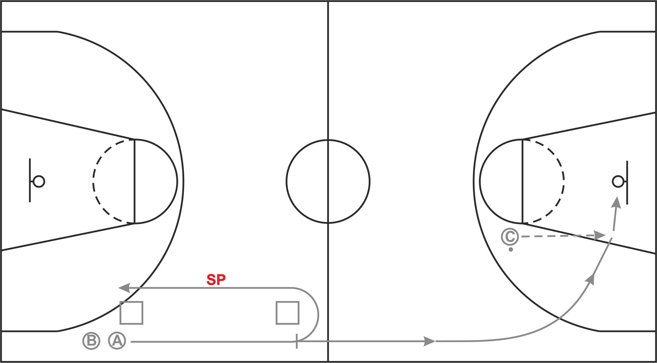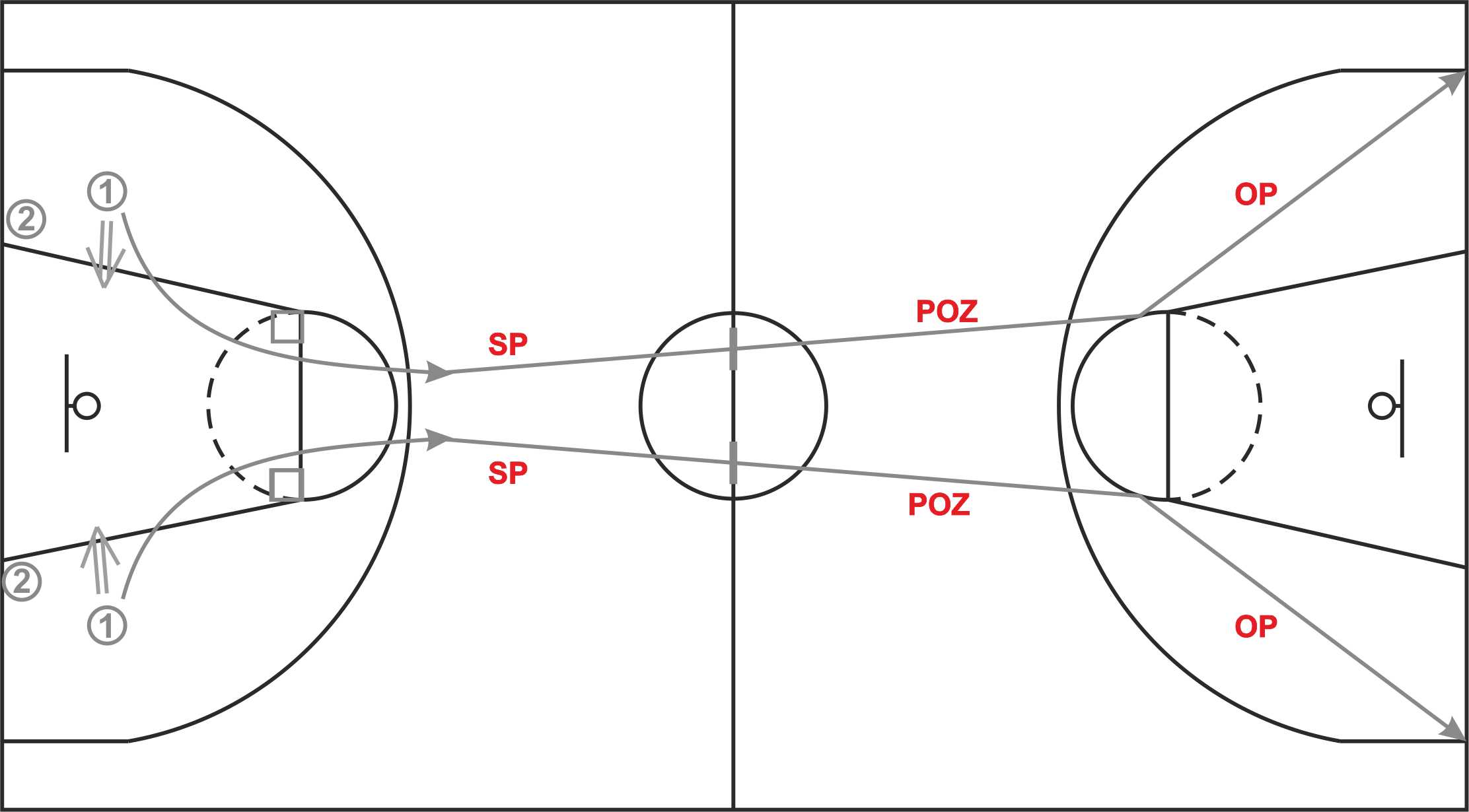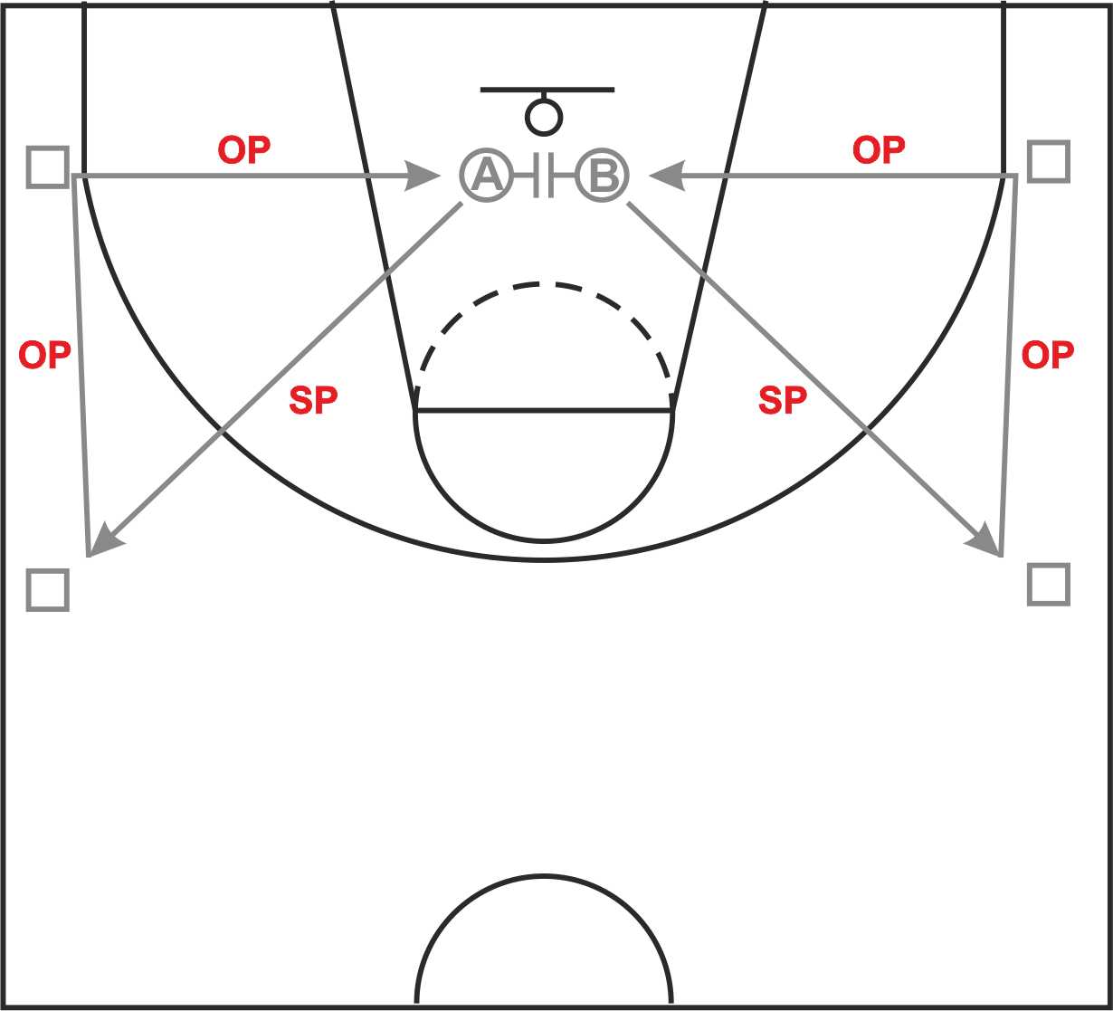 - Hráči 1 a 2 mají míč a stojí v rohu hřiště. Obránci A a B začínají „přetlačováním“ pod košem po dobu 3 sec.. Na pokyn trenéra se snaží co nejrychleji dostat „pod kontrolu“ hráče s míčem na protější straně. Útočníci 1 a 2 začínají driblink ke kuželu a zpět v momentě, kdy A a B opouští vymezené území. Obránci se snaží sprintem, resp. obranným pohybem sledovat útočníky, když jsou zpět na koncové čáře sprintují pod koš, opět se přetlačují, na pokyn trenéra cvičení pokračuje.