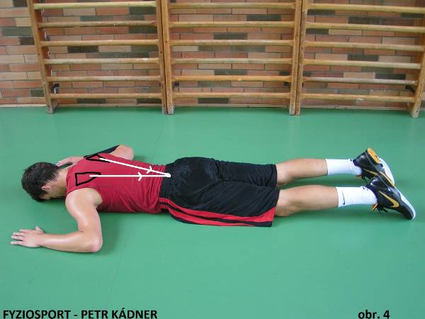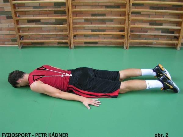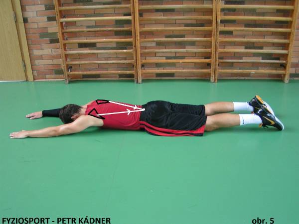 V praxi si výše uvedený postup ukážeme na cviku zvaném „Medvěd“ a jednoduchém cvičení k prevenci přetížení horní porce trapézového svalu resp. upevnění či nápravě pohybového stereotypu fixace lopatky. Cvik na obrázku č. 2 je základní poloha pro tzv. uvědomění si práce dolních fixátorů lopatky. Cvičenec je v poloze na břiše s hlavou opřenou o čelo a horními končetinami v zevní rotaci v ramenním kloubu (dlaněmi k zemi). Pletenec ramenní nejdříve pasivně uvedeme do požadované polohy, což je tzv. deprese lopatky (obr. 3). Pletenec ramenní uchopíme jednou rukou z přední a druhou ze zadní strany a pohybujeme jím tak, aby se dolní úhel lopatky pohyboval směrem k poslednímu bedernímu obratli, poté vyzveme cvičence, aby udržel lopatku v námi nastavené poloze a polohu i práci svalů ji fixujících si uvědomil za pravidelného dýchání. Totéž provedeme i na druhém pletenci ramenním. V další fázi vyzveme cvičence, aby pohyb provedl sám a případně jej korigujeme. Zde není tolik důležitý počet opakování a délka výdrže, nýbrž uvědomění si polohy lopatky. Pokud cvičenec provádí cvik správně, přistoupíme ke ztížení cviku pomocí změny polohy horních končetin. Poloha horních končetin „do svícnu“ (obr. 4) a vzpažené horní končetiny (obr. 5).