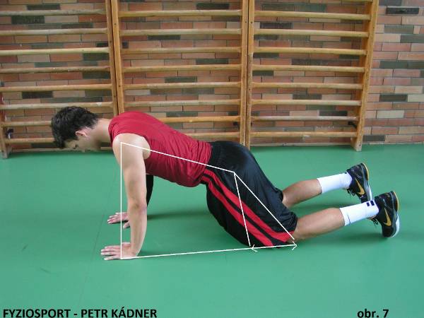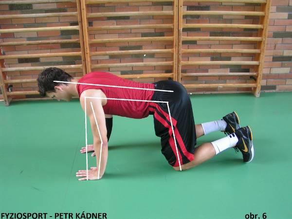Dalším stupněm je poloha v podporu klečmo, ramenní kloub se promítá na dlaně, loketní kloub je mírně pokrčen a kyčelní kloub mírně před kolenní kloub, hlava v prodloužení páteře (obr. 6). Dalšími variacemi pro toto cvičení jsou střídavé zatěžování horních a dolních končetin bez změny polohy trupu a také provádění těchto cviků při zvětšené vzdálenosti dlaní a kolen (obr. 7).