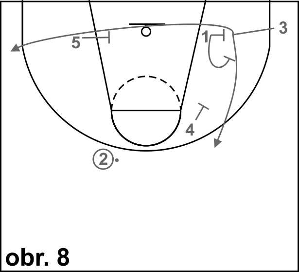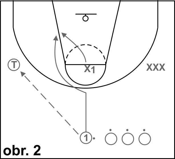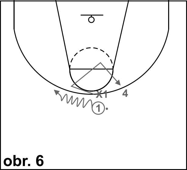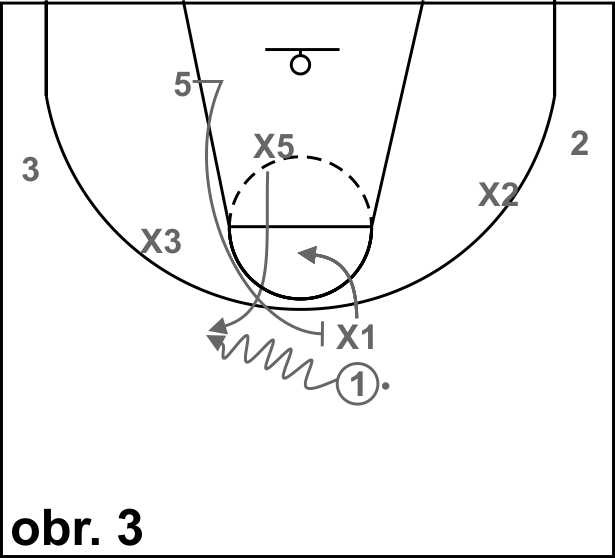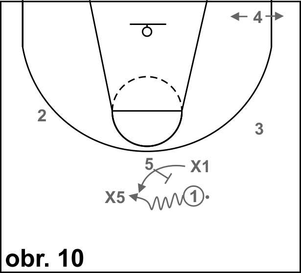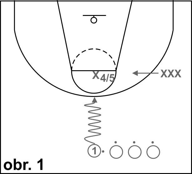 Na obrázku 1 dribluje hráč 1 na místě na hranici středového kruhu, obránce x4/5 je připraven na čáře trestného hodu. Na pokyn trenéra vyrazí hráč 1 směrem ke koši a snaží se zakončit.Úkolem bránícího hráče je udržet útočníka po dobu nejméně 5 vteřin.