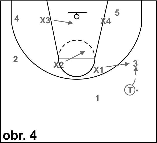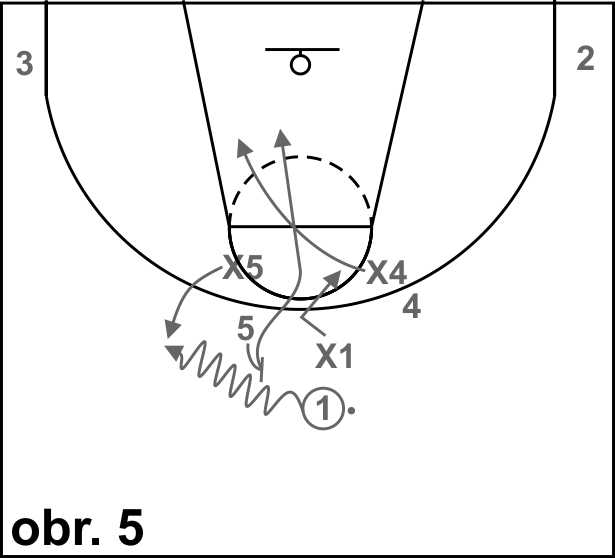 Na obrázku 4 je znázorněna situace 5 útočníků proti 4 obráncům, do které se družstva dostávají hlavně v momentech, kdy řeší clonu pro hráče s míčem zdvojováním, nebo vysokým předskokem (hard hedge). Cvičení začíná přihrávkou trenéra jednomu z útočníků, ke kterému přistoupí nejbližší obránce. Úkolem obrany je aktivně bránit hráče s míčem a nepustit jej do středu hřiště, ostatní obránci jsou ustoupeni do vymezeného území a jsou připraveni přebrat, nebo zabránit útočníkovi s míčem vniknout do vymezeného území (rotace). Obrana by se měla vyvarovat situací, kdy 2 obránci brání hráče s míčem. Útočníci mají k dispozici pouze 2 driblingy. Útočící pětice může mít k zakončení určený časový limit (7 – 15 vteřin). Kritická místa: a) udržet rovnováhu v situacích, kdy obránci dobíhají nebo přistupují k útočníkovi s míčem (close out), b) obránci ze slabé strany musí být minimálně jednou nohou ve vymezeném zemí, c) obránce hráče s míčem musí vyvíjet tlak na míč, aby se útočník nemohl koncentrovat na čtení situace.