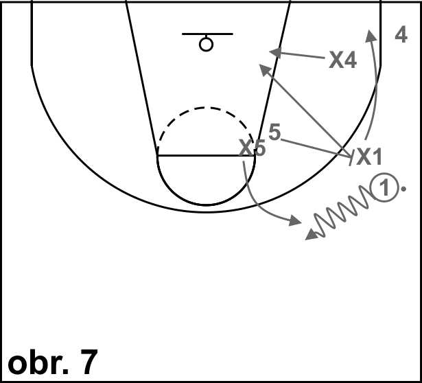 2. Clonění pro hráče s míčem (pick and roll/pop) – Magnano typovou situaci s dvěma podkošovými hráči v horním postavení, tak jak je znázorněna na obrázku 5, řeší přebráním a rotací mezi obránci x5, x1 a x4. Tuto obrannou kombinaci pojmenoval tandem – nejprve obránce x5 přebere útočníka s míčem 1, seběhnuvšího, clonícího hráče 5 přebere obránce x4 a původní obránce hráče s míčem x1 přebere útočníka 4. Touto kombinací se dostaneme do podobné situace, kterou jsme řešili na obrázku3. Klíčovým bodem tohoto obranného řešení je komunikace. Na obrázku 6 je znázorněn pohyb obránce x1, který přebírá hráče 4 – nepřistupuje k hráči co nejkratší cestou, ale nejprve běží šikmo vzad, směrem ke koši a až poté přistupuje k hráči 4. Na obrázku 7 je znázorněno stejné obranné řešení (tandem), ale v prostoru u postranní čáry (clona pro hráče s míčem, který se uvolňuje od postranní čáry směrem do středu hřiště.