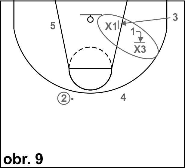 3. Clonění mezi hráči z perimetru u koncové čáry – na obrázku 8 je znázorněno rozmístní útočníků, které vzniká nejčastěji uvolněním středního rozehrávače kolem jednoho z podkošových hráčů (UCLA cut) nebo v útočném systému flex offence. Hráč 3 si může vybrat, jestli se uvolní po zakončení střelbou směrem na vrchol tříbodového oblouku (kolem clonících spoluhráčů 1 a 4, nebo zvolí uvolněné podél koncové čáry a využije clonících spoluhráčů 1 a 5. Na obrázku 9 je znázorněno obranné řešení této situace – obránce x1 je připraven přebrat útočníka 3 v oblasti u koncové čáry, asi jeden metr za útočníkem 1. Obránce x3 přebere útočníka 1, přičemž se automaticky postaví do jeho předpokládané dráhy pohybu. Obránci x1 a x3 vyvolávají svým postojem a postavením kontakt s útočníky (bump), čímž dojde k vychýlení útočníků z jejich ideálních drah pro uvolnění a tím pádem k narušení načasování celé kombinace.